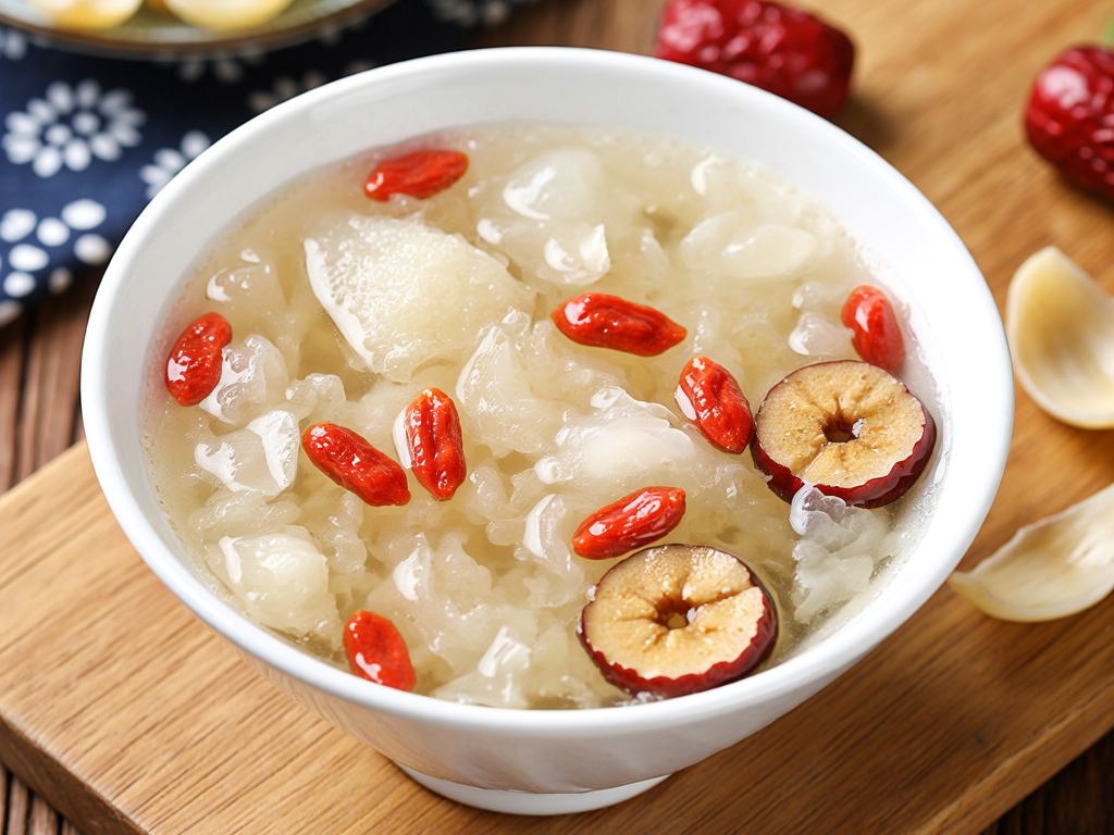 材料:銀耳半朵、梨1個(gè)、大棗3顆、枸杞一小把、冰糖適量。